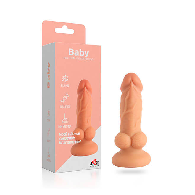 Mini prótese peniana, feita em silicone atóxico com resistência a água no formato de pênis realístico com glande definida, veias salientes, escroto e ventosa.