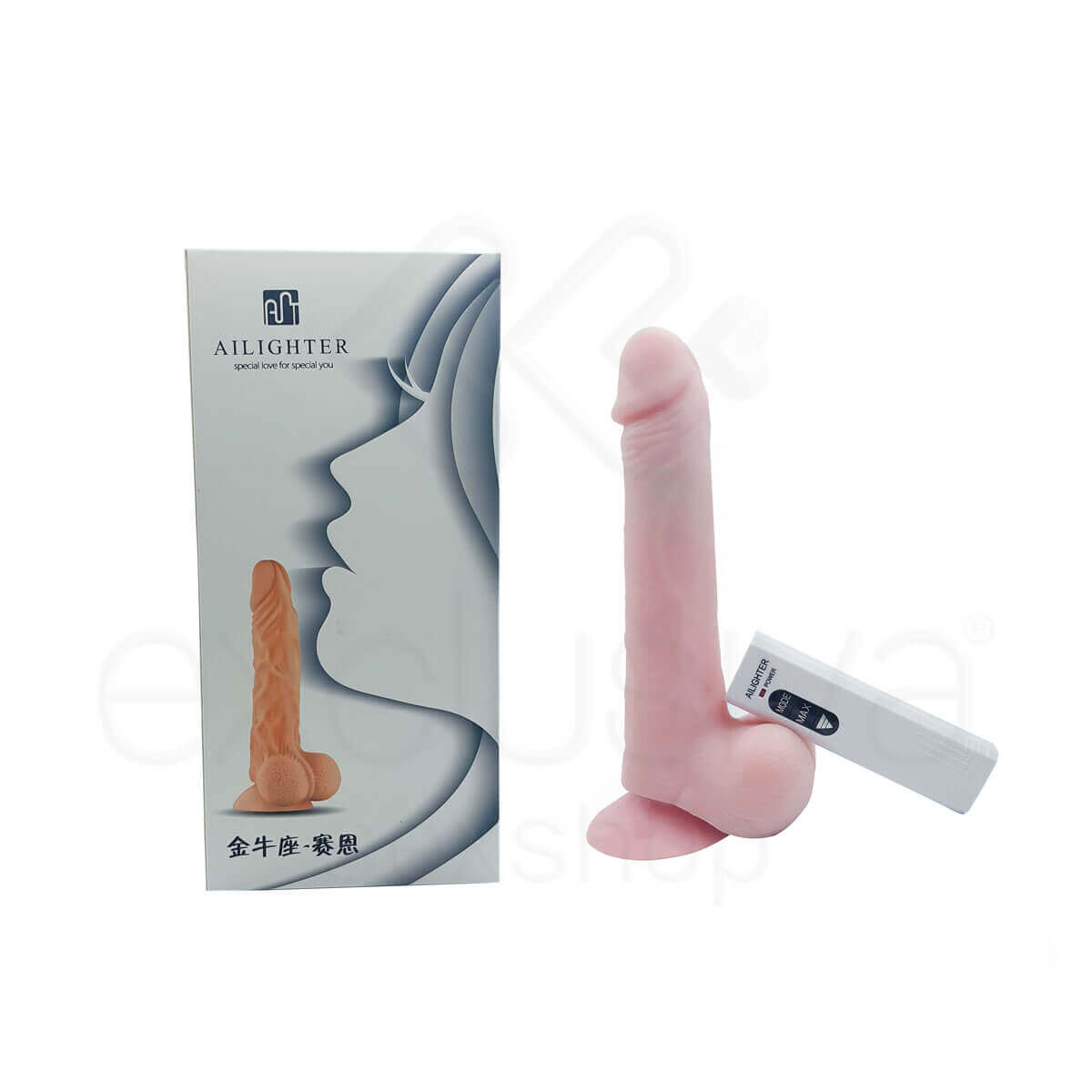 É uma prótese em silicone atoxico que possui glande definida, veias salientes, escroto, ventosa e 10 modos de vibração com ajuste de intensidade.