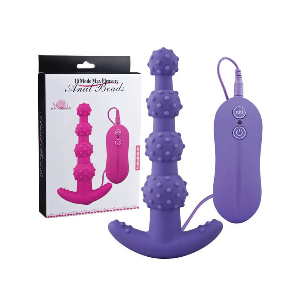 Plug anal com 4 esferas em tamanhos gradativos com textura em relevo e 10 tipos diferentes de vibração, controladas por controle remoto de fio.