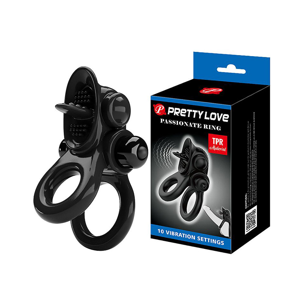 Deixe suas ereções mais fortes e intensas com o anel peniano duplo "Passionate Ring" da Pretty Love. Confeccionado em TPR atóxico, ele possui anel para pênis e escroto com 10 vibrações poderosas e língua estimuladora de clitóris. Quer saber mais? Confira abaixo!
