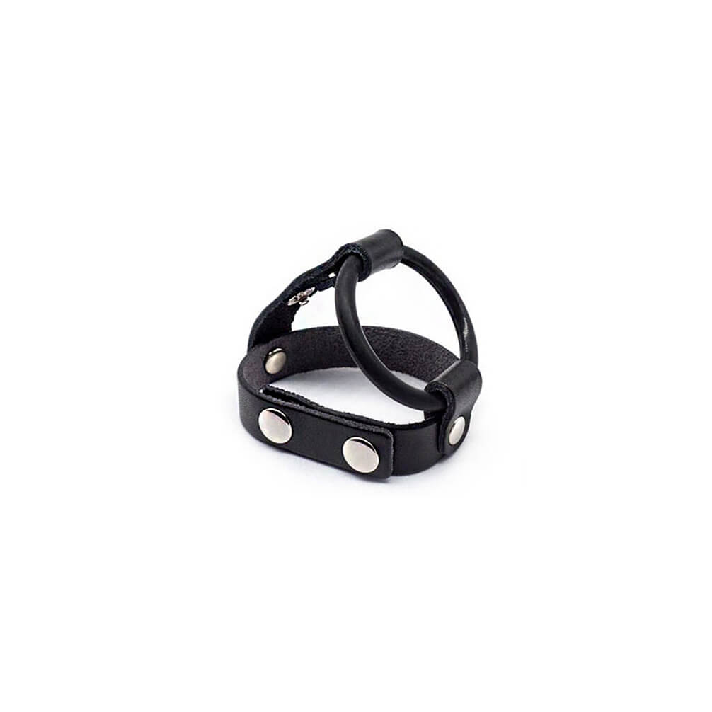 Anel peniano em silicone com de tiras em material sintético para retração testicular. Deixando suas fantasias mais prazerosas e duradouras!