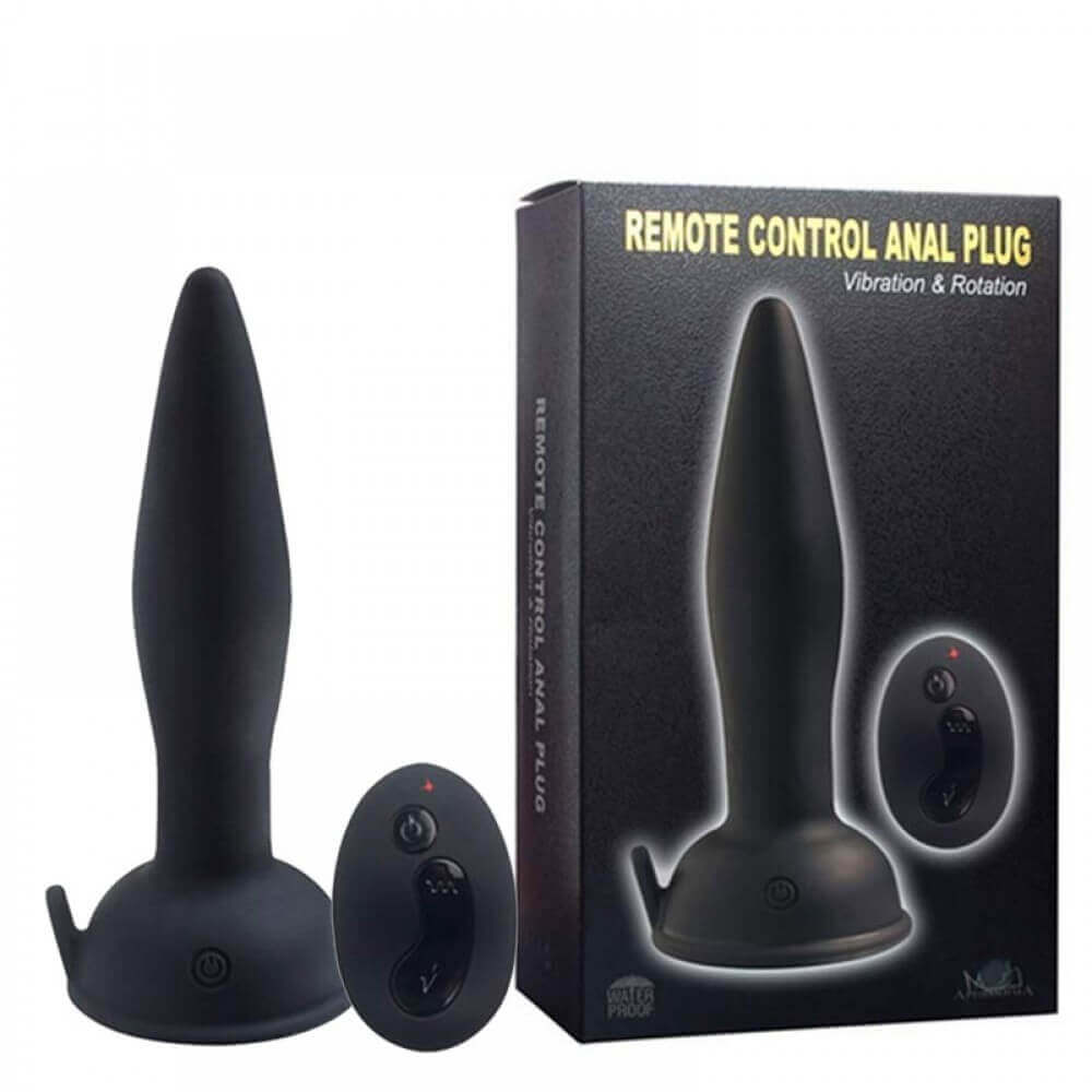 Plug anal recarregável em silicone macio e suave ao toque. Possui ventosa, controle remoto sem fio com modo turbo e 5 modos de vibrações e rotações.
