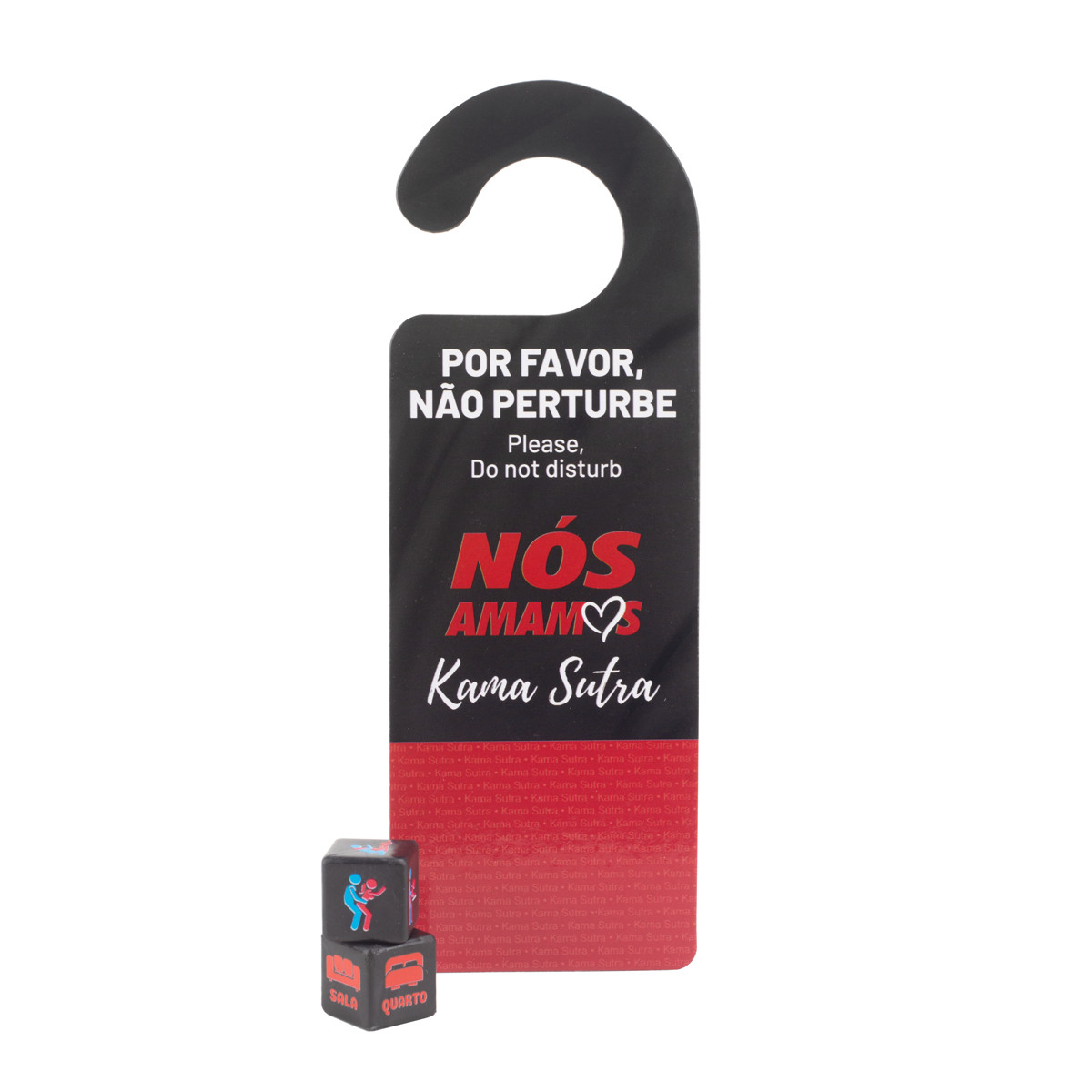 Aviso de Porta e Par de Dados "Nós Amamos Kama Sutra" Hétero da Diversão ao Cubo. Explore novas posições e crie momentos inesquecíveis de prazer a dois, enquanto mantém a privacidade e o clima envolvente. Este produto traz diversão e inovação para suas brincadeiras. Quer jogar com seu amor?