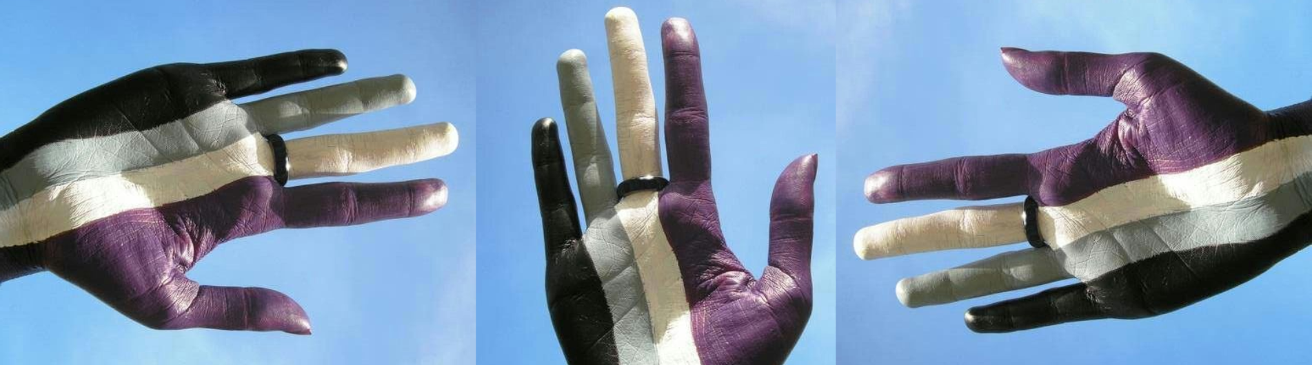 (Bandeira Assexual – preto se refere a assexuais estritos, cinza a atração parcial, branco a parceiros não-assexuais e aliados, roxo representa a comunidade como um todo.)