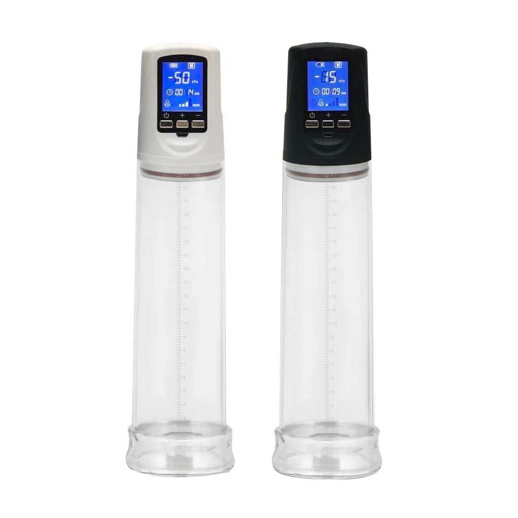 Bomba peniana elétrica "Penis Pump" com monitor digital, tubo transparente e anel em silicone adaptável para qualquer tipo e tamanho de pênis. Recarregável via USB.