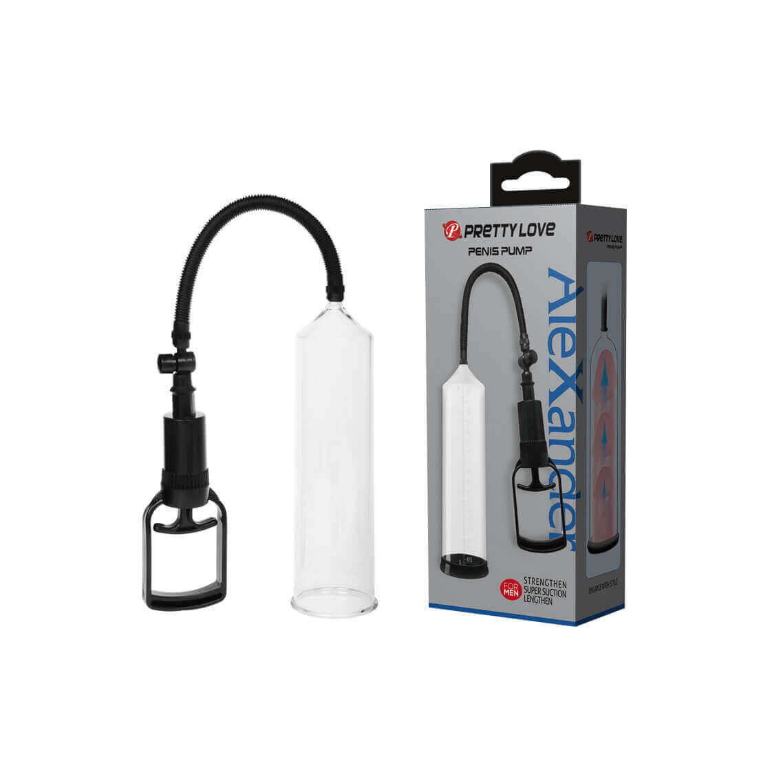 Bomba peniana em TPR. Possui manopla para sucção do ar e 3 anéis vedadores, sendo um com forma de vagina e os outros 2 com diâmetros internos diferentes.