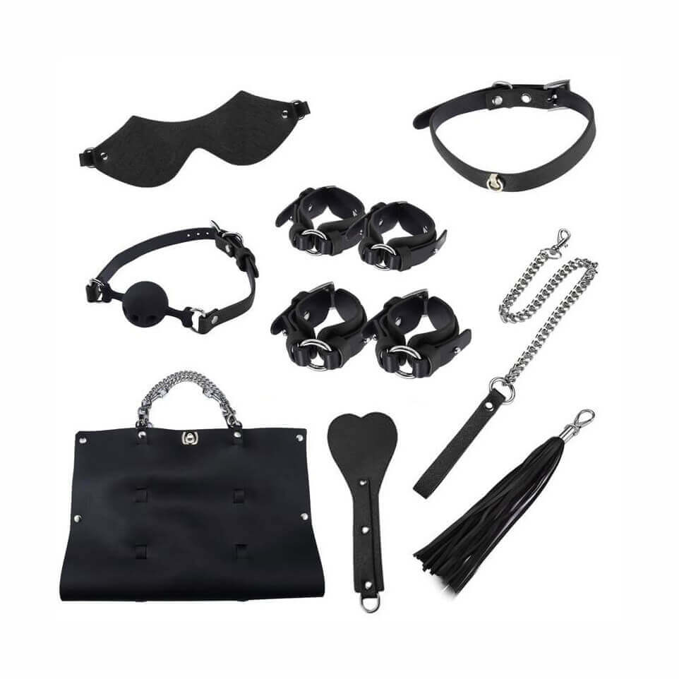 Seus componentes foram desenvolvidos para cada preferência e gosto sendo eles: 01 Palmatória com detalhes de metais leves; 01 Venda para os olhos com detalhes em rebites e ajuste em fivela; 01 Par de algemas e 01 Par de tornozeleiras com fivelas ajustáveis e argola em metal; 01 Mordaça com esfera em borracha e detalhes em rebites; 01 Chicote com tiras em couro; 01 Conjunto de 04 prendedores que interligam as algemas nas tornozeleiras; 01 Coleira para pescoço com argola central e 01 Corrente guia para coleira em metal.