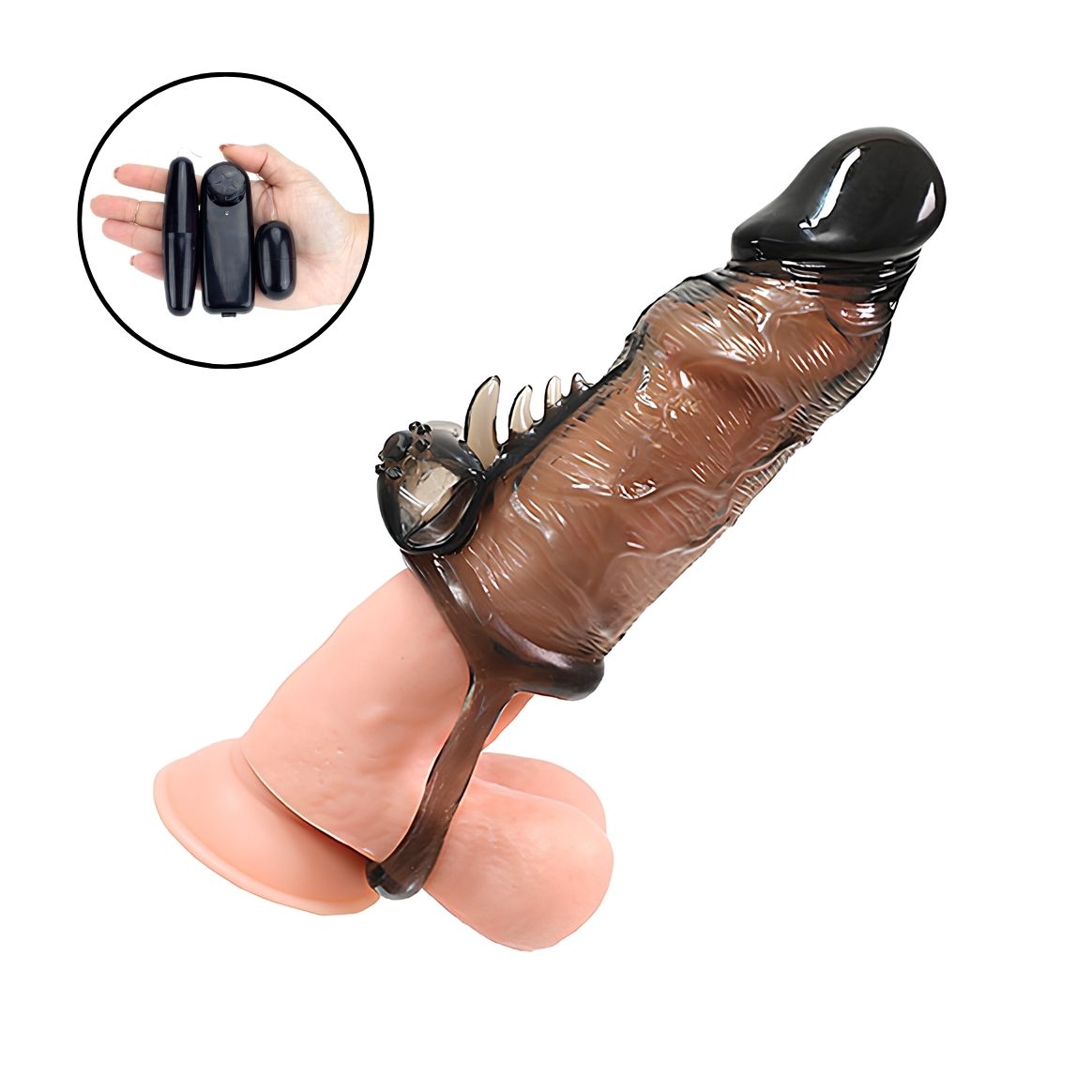 Capa peniana em formato de pênis realístico com anel para prender no escroto e cápsulas vibratórias para aumentar mais o prazer. Feita em silicone flexível.