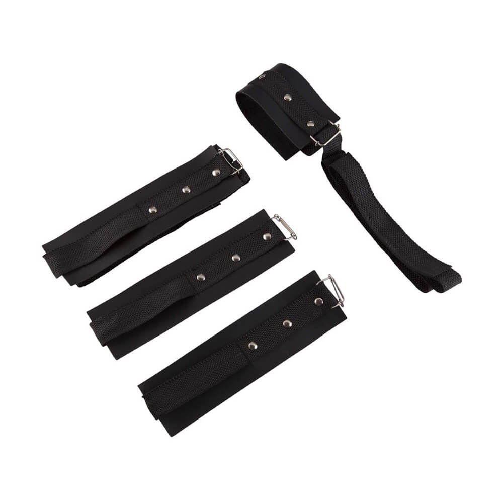 Kit bondage composto por 4 amarras confeccionadas em couro sintético com tiras feitas em nylon e fivelas ajustáveis para uma regulagem segura e confortável.