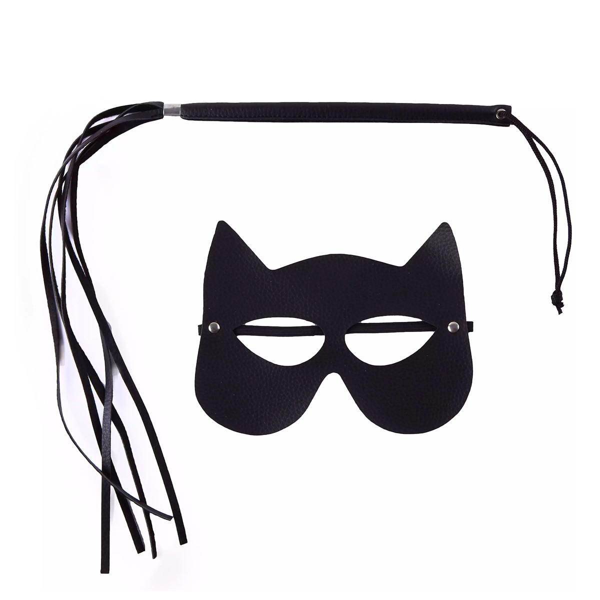 Kit sadomasoquista composto por chicote em couro sintético com alça de segurança e máscara mulher gato em couro sintético com elástico.