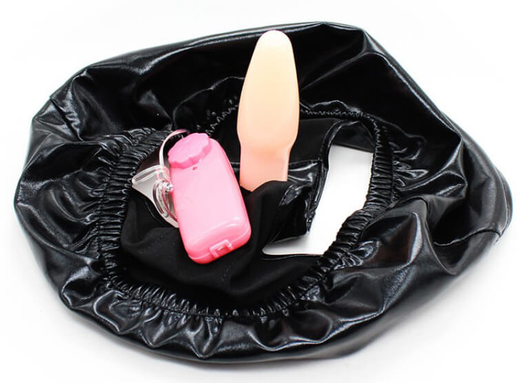 Calcinha confeccionada em vinil e couro sintético com plug anal em formato cônico e vibração multivelocidade, controlada por controle remoto de fio.