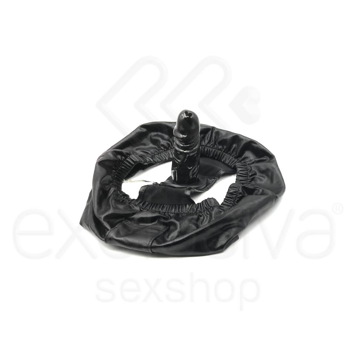 Calcinha confeccionada em vinil e couro sintético com plug anal em formato de pênis realístico, com veias e vibração multivelocidade.