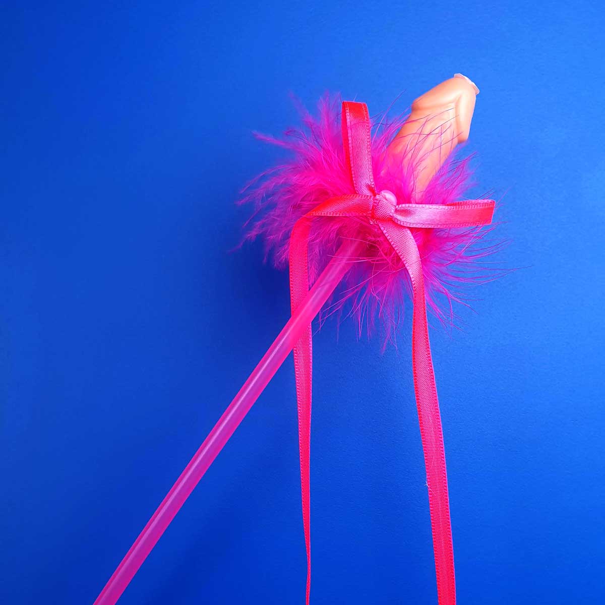 Canudo com formato de varinha mágica e decorado com mini pênis, pluma e laço. Chega mais!