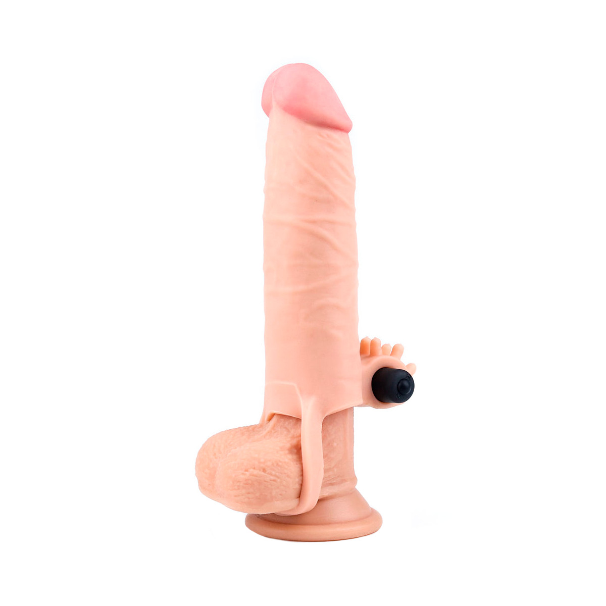 Capa peniana em TPR ultra macio e flexível com preenchimento de 5 cm, anel para encaixe no escroto, saliências para estimulação do clítoris e cápsula vibratória! Vem cá que eu te conto mais!