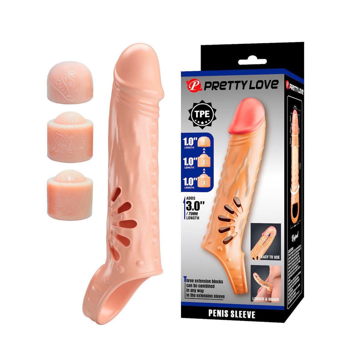 A capa peniana em TPE da Pretty Love possui texturas estimulantes e 3 pontas extensoras, garantindo prazer extra e intensidade na relação. Com anel para escroto para dar um UP!
