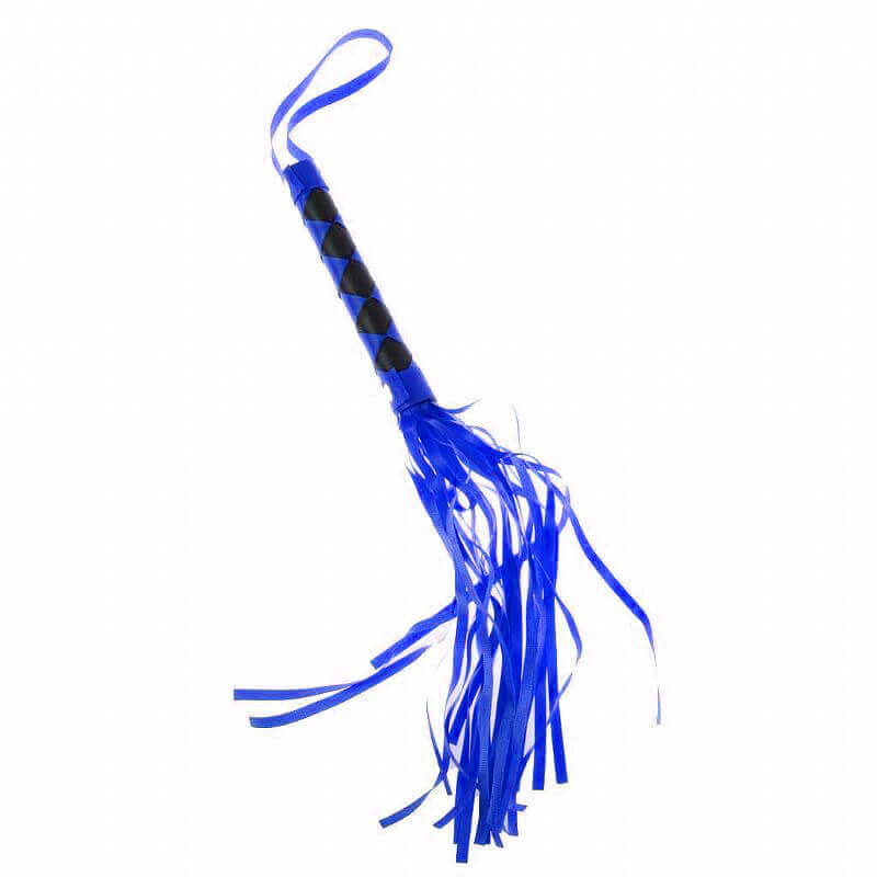 Chicote com tiras feitas em couro sintético e alça no cabo.