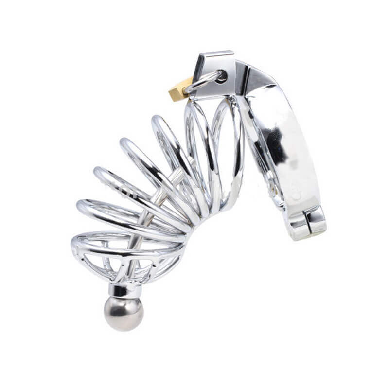 É um cinto de castidade em aço inoxidável com sonda uretral, anel para escroto e cadeado com 3 chaves.