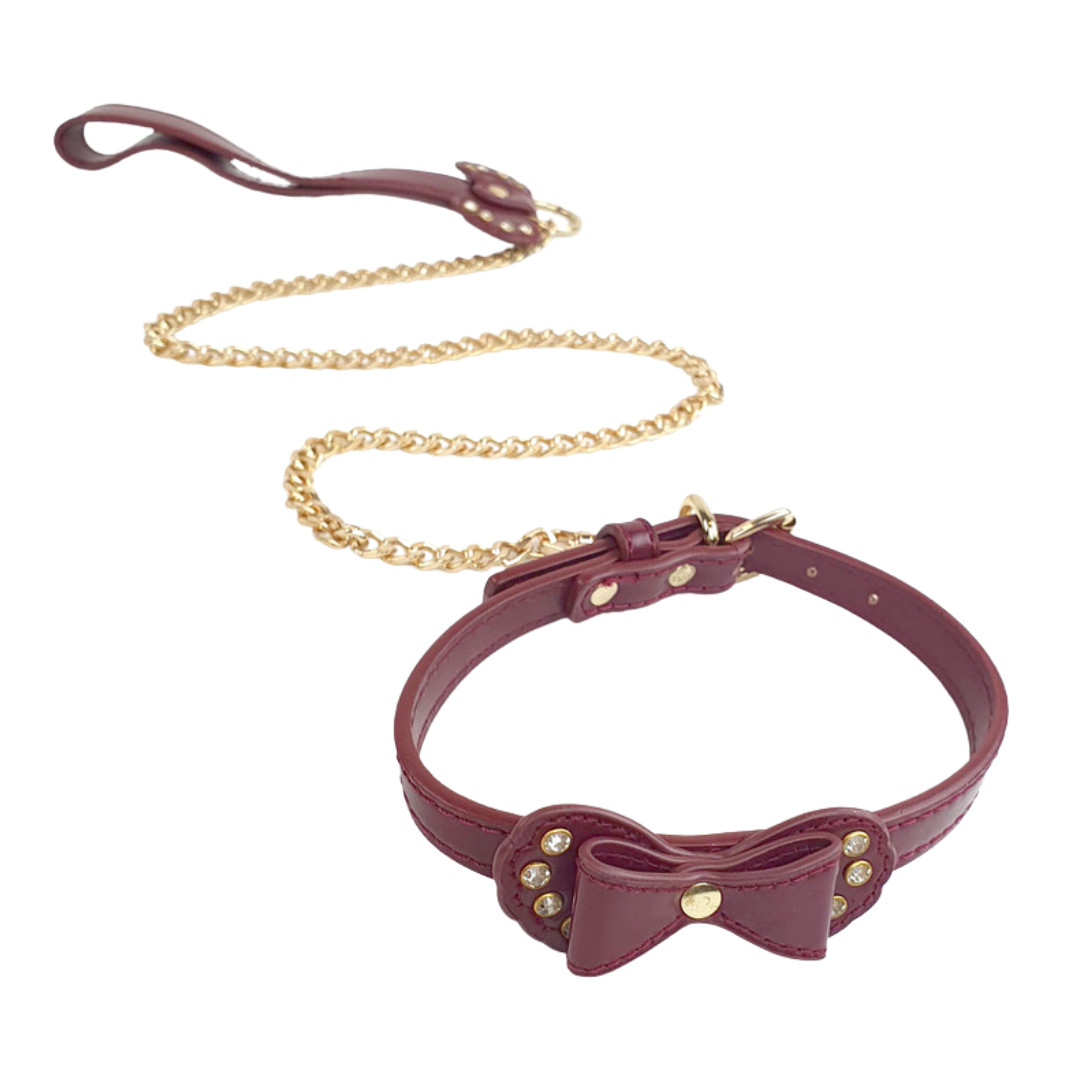 A Coleira Fetich Bondage, é um modelo feito em couro sintético com detalhe de laço com detalhes em rebites e guia com corrente de metal luxuosa. Vem saber mais desse acessório aqui!