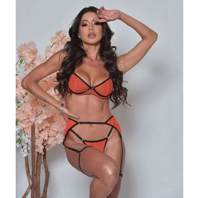 Conjunto super lindo de malha telada e cinta liga com persex! Você precisa dessa lingerie para te deixar ainda mais maravilhosa, desce aqui que eu te conto tudinho!