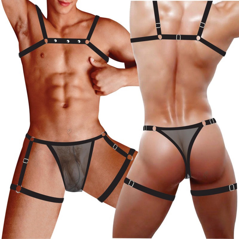 O conjunto é tamanho único, com cueca em tecido elástico e harness ajustável. Veste bem do manequim 38 ao 44 (P ao G).