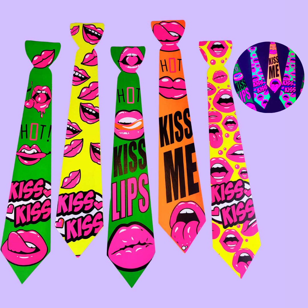 Conjunto de gravatas feitas em papel especial que brilha sob a luz negra, produzindo efeito neon. Chega mais e confira!