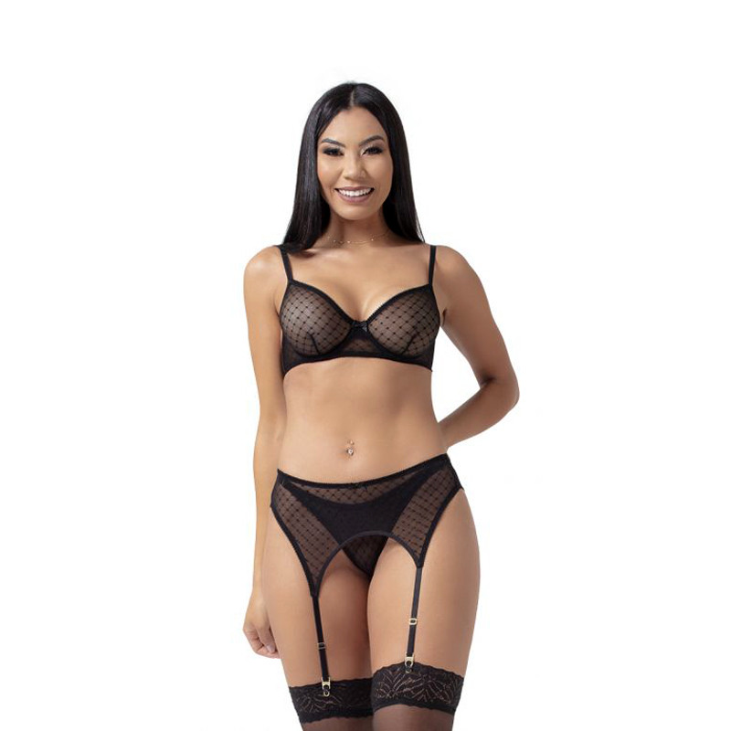 Fique linda e sensual com o conjunto da Sapeka Lingerie. Composto por um sutiã sem bojo ele possui alças ajustáveis e aro de sustentação dos seios. Acompanha uma calcinha fio dental e uma cinta liga toda detalhada. Confira abaixo!