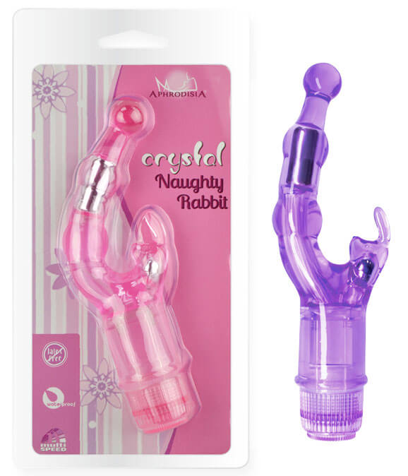 Vibrador estimulador de Ponto G com esferas estimulantes e estimulador clitoriano em forma de coelho. Possui 2 motores com vibração multivelocidade, controlada pelo botão giratório.