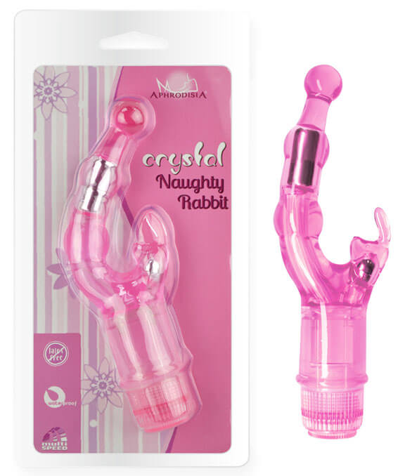 Vibrador estimulador de Ponto G com esferas estimulantes e estimulador clitoriano em forma de coelho. Possui 2 motores com vibração multivelocidade, controlada pelo botão giratório.