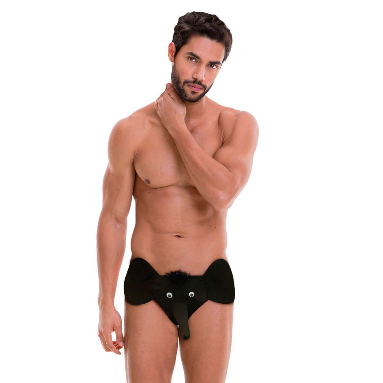 Cueca modelo tanga com orelhas e tromba de elefante com abertura do lado de dentro para encaixar o pênis, a tromba possui também, uma abertura do lado de fora!