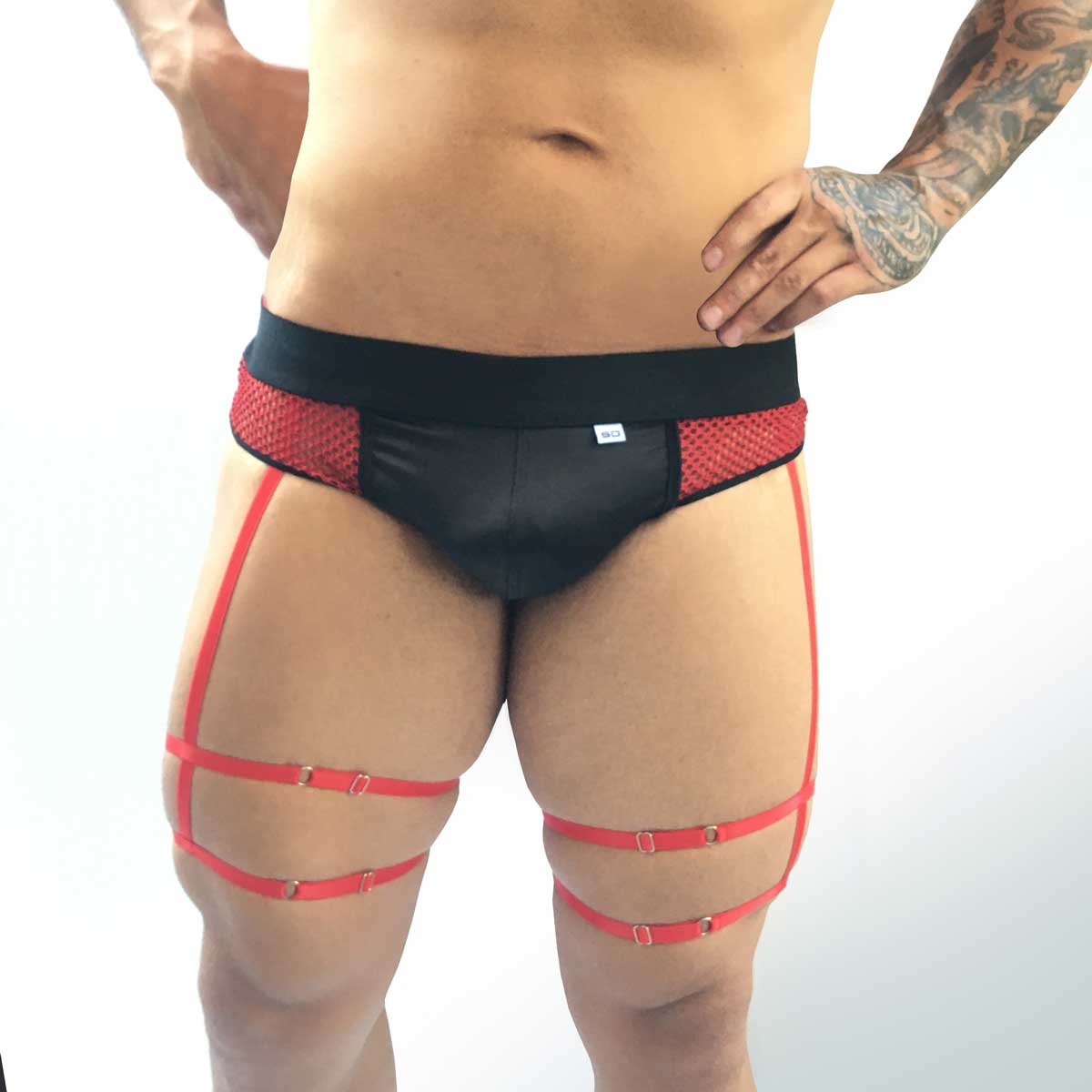 Cueca modelo strap em suplex e arrastão com abertura traseira, elásticos laterais e cinta-liga interligado ao persex. Ousadia, poder e sensualidade! Chega mais!