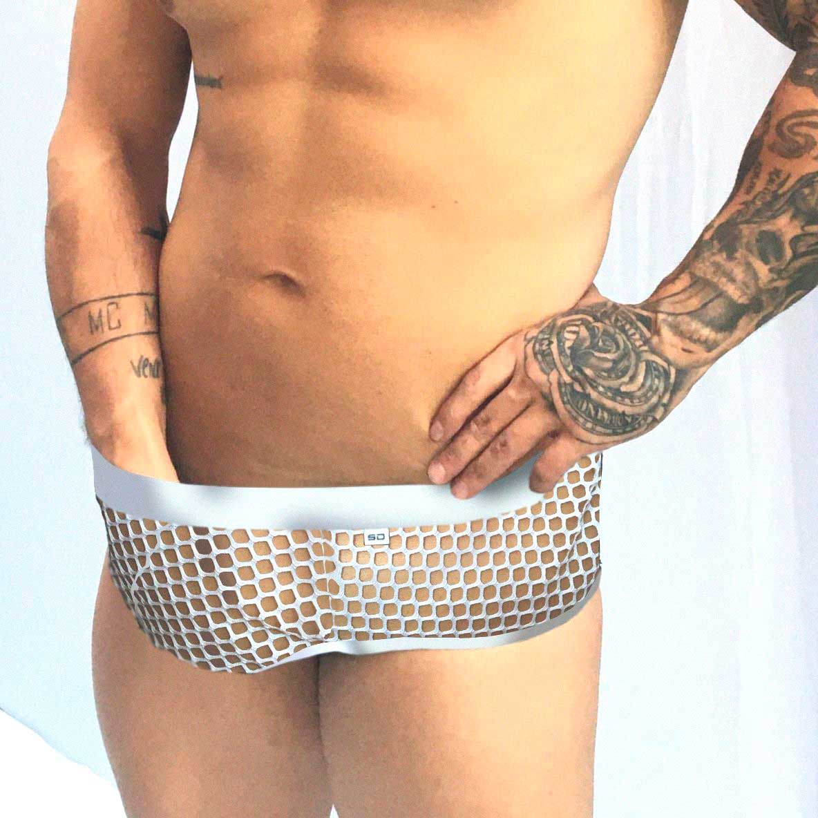 Cueca com modelagem de sunga feita em arrastão com abertura traseira e cós elástico. Perfeita para surpreender sua parceria! Ui, venha conferir!