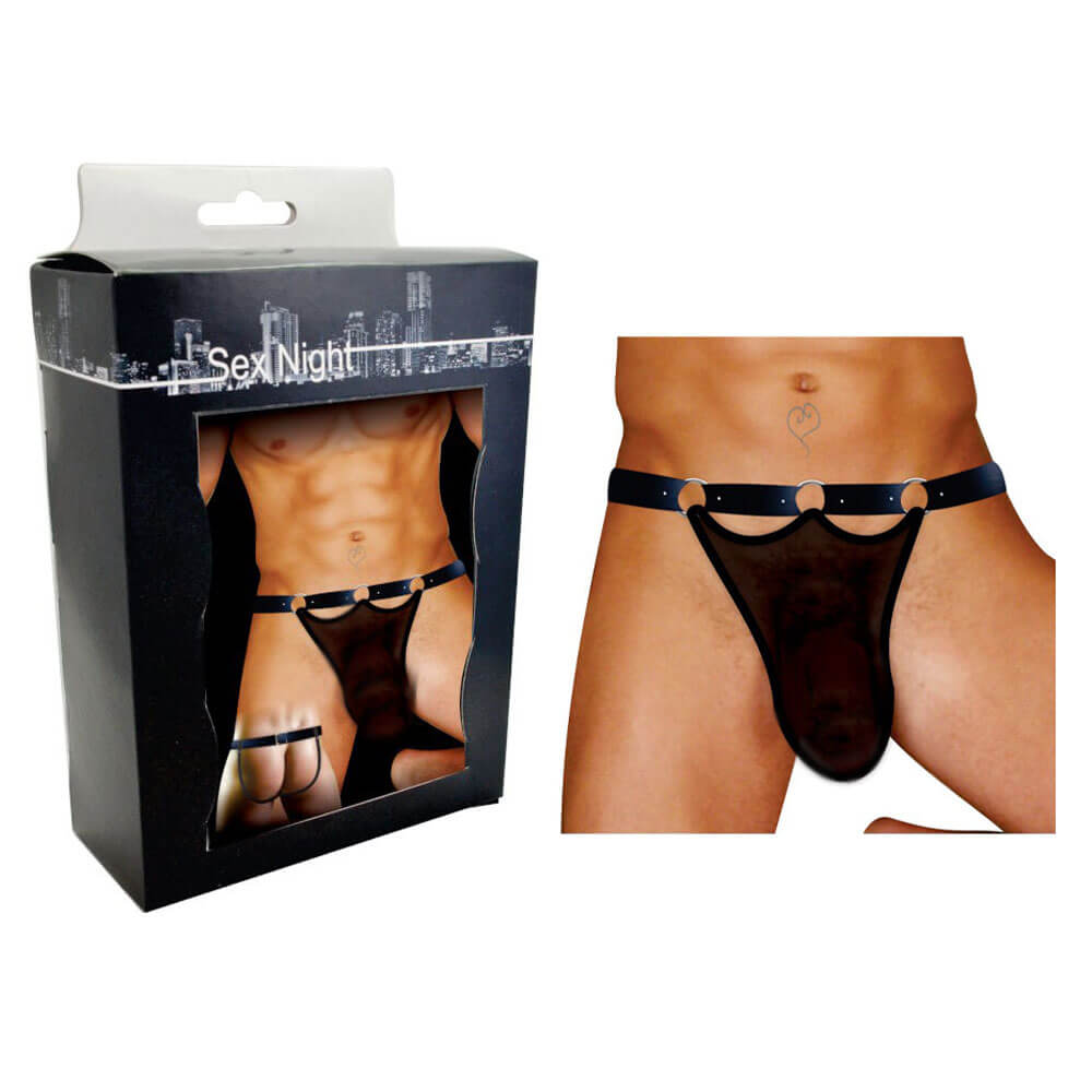 Tanga em tule transparente, provocante e sedutora! Alça em couro ecológico, detalhes de argolas, perfeitas para incrementar a brincadeira!