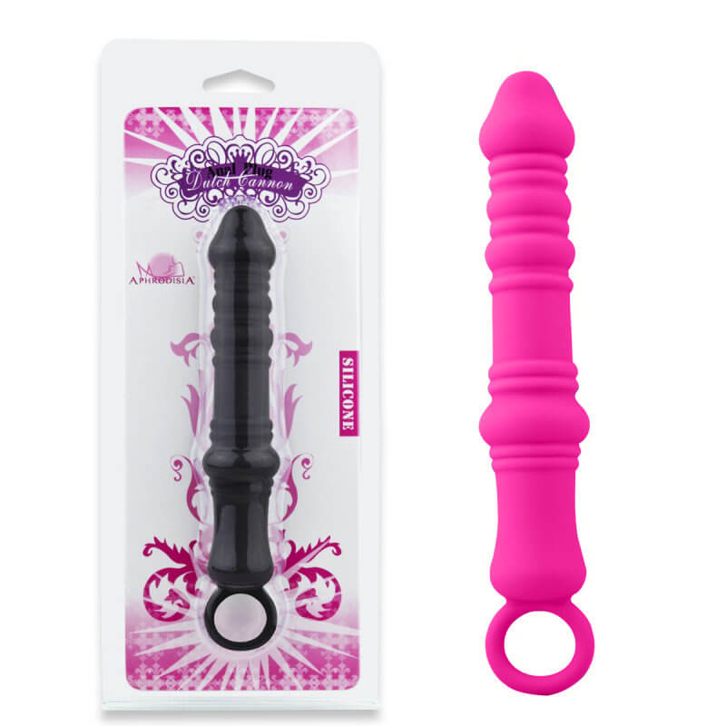 Plug anal rosa com textura anelar, extremidade superior semelhante a uma glande e alça de segurança. Aproveite!
