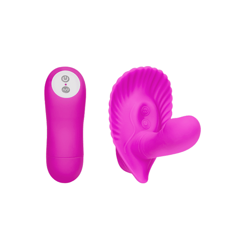 Estimulador clitoriano estilo Butterfly com formato de concha. Mini pênis penetrável, 10 vibrações e com controle remoto sem fio, se joga, amor!