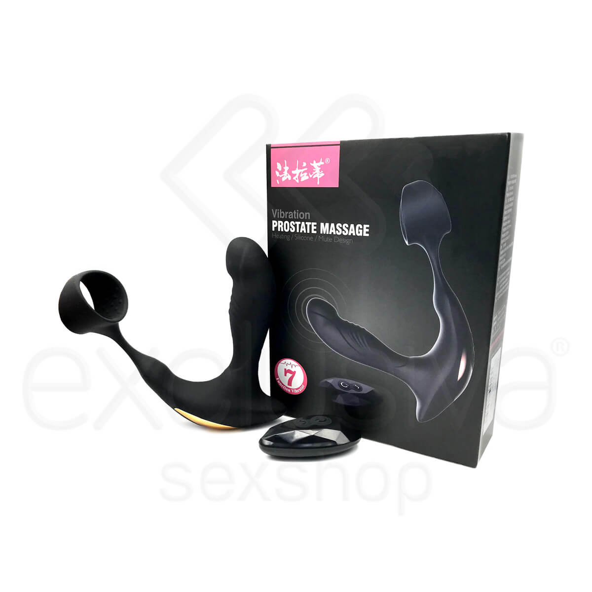Estimulador de próstata e períneo totalmente feito em silicone, com anel peniano texturizado, função aquecimento, 7 vibrações e controle sem fio.