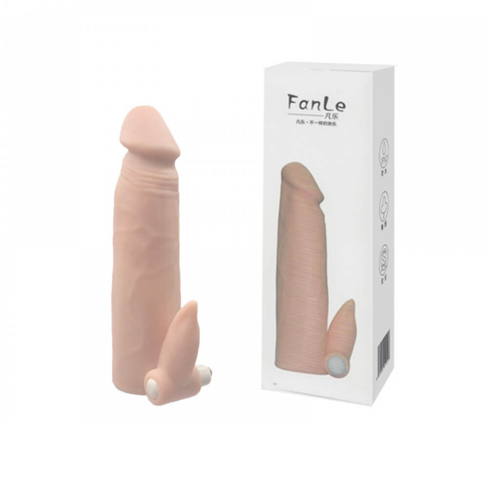 Capa peniana extensora em forma de pênis com estimulador de clítoris e vibração única, confeccionado em TPR de qualidade com toque macio e suave a pele.