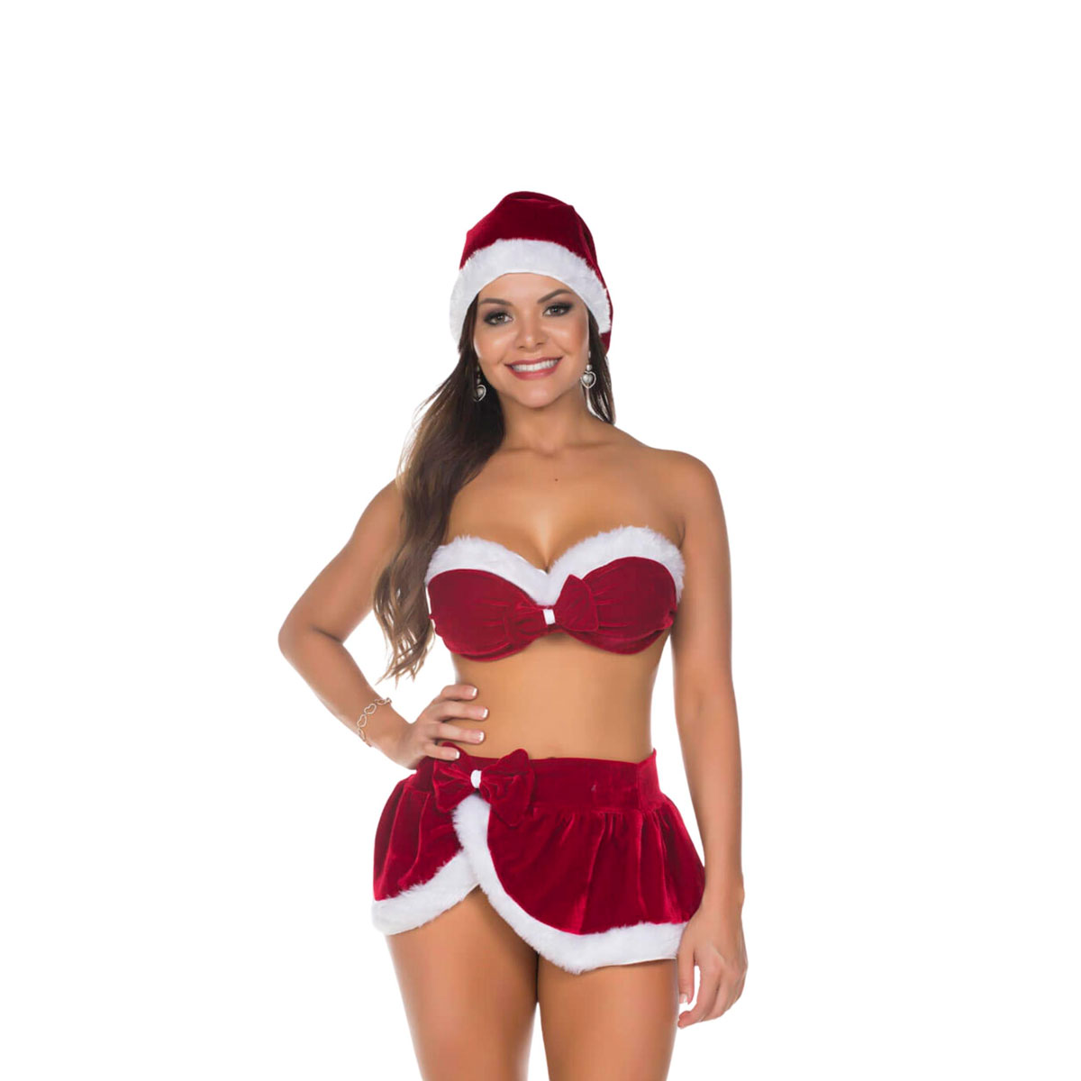 Fantasia "Mamãe Noel de Saia" feita em tecido levemente aveludado, composta por um sutiã/tomara que caia, calcinha fio dental, saia em elastano e gorro natalino.