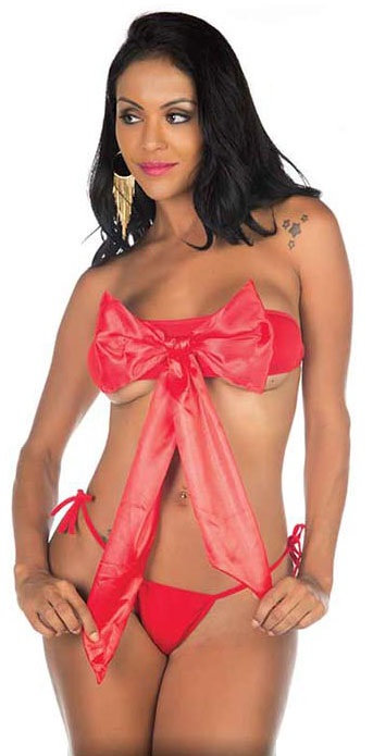Conjunto composto por top tomara que caia de amarrar com detalhe de laço no busto e calcinha fio dental com ajuste em amarras nas laterais.