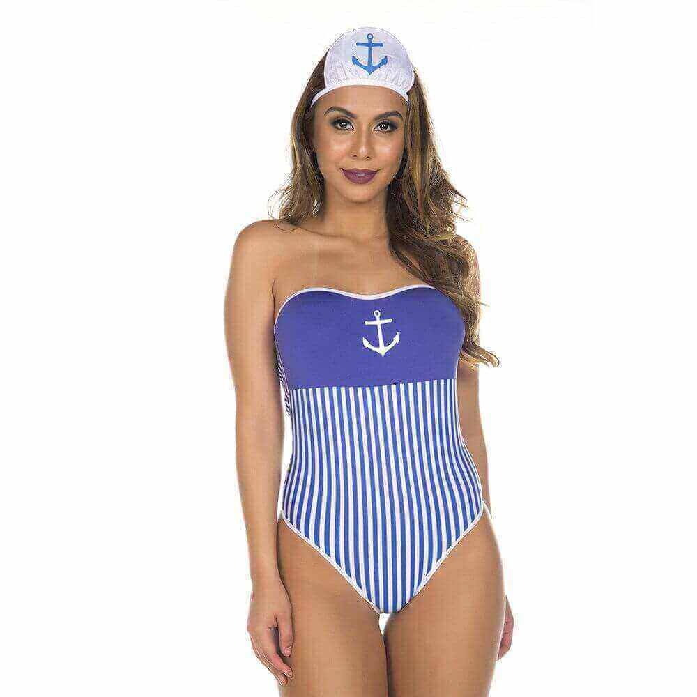 Mini fantasia confeccionada em malha composta por um body com tiras de amarrar e acessório para cabeça.