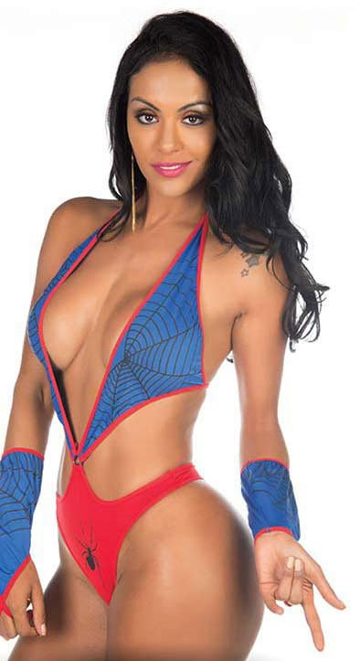 Mini fantasia composta por body frente única com decote profundo, recortes nas laterais e par de luvas de dedo, com estampa no tema.