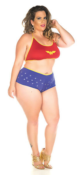 Para proteger os fracos e combater os bandidos só mesmo uma mulher de "peso", abuse e use a mini fantasia mulher maravilha plus size.