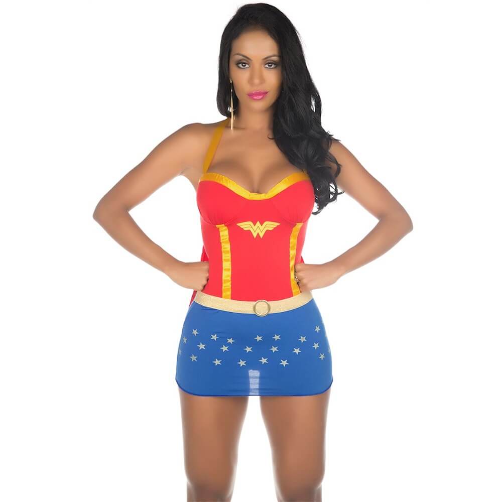 Fantasia composta por vestido confeccionado em malha com capa de super herói e calcinha fio dental confeccionada em tule transparente.