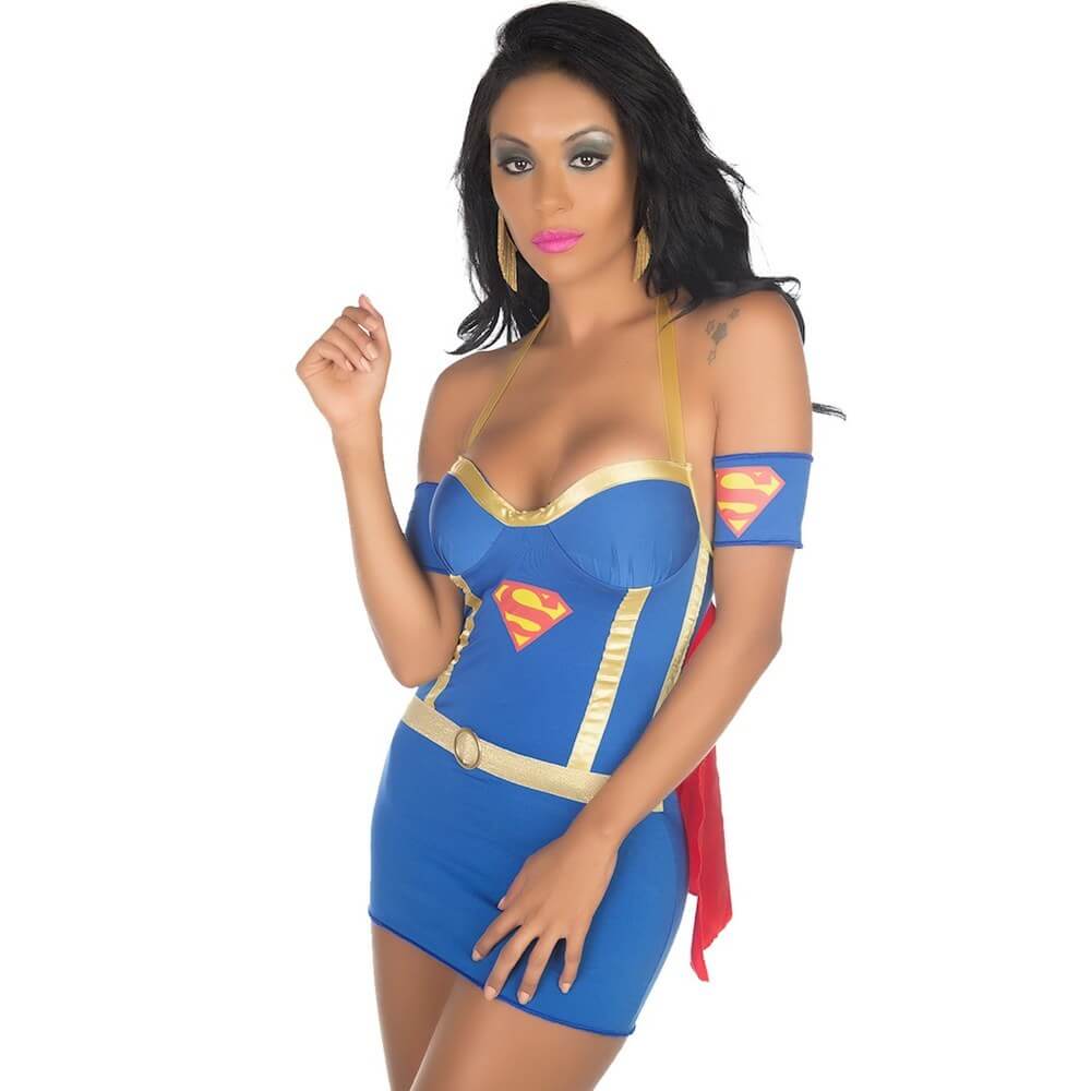 Fantasia composta por vestido confeccionado em malha com capa de herói, par de braçadeira e calcinha fio dental.