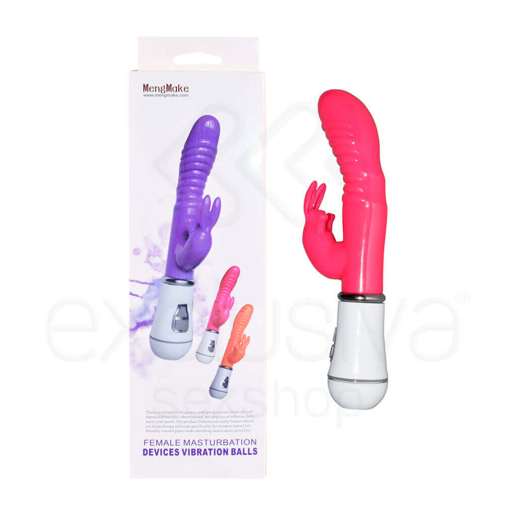 Vibrador confeccionado em silicone com estimulador de clítoris em forma de coelho, 10 modos de vibração e textura ondulada. Disponível na cor rosa.