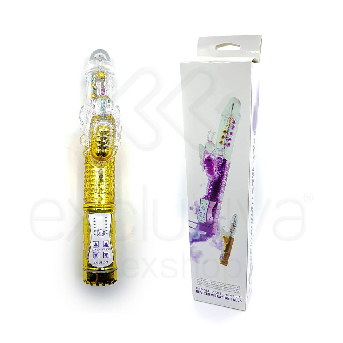 Vibrador rotativo com glande definida, estimulador em forma de borboleta com vibro, possui um botão que inverte o sentido da rotação e um painel simples.