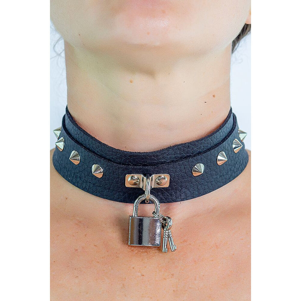 Gargantilha feito em couro sintético que possui cadeado com par de chaves, botões de pressão com 3 etapas de ajuste e detalhe em spike de níquel. Explore a pratica do sadomasoquismo e vivencie momentos intensos e dominadores.
