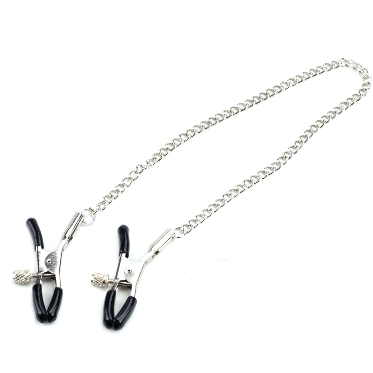 Grampos para mamilos em forma de presilhas ajustáveis, com revestimento de borracha e corrente metal interligando-os.