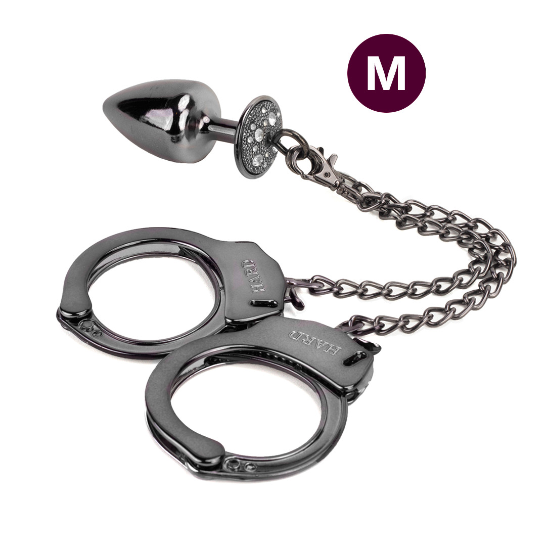 Par de algemas feitas em metal com 2 chaves para destravamento, trava de segurança e um plug anal cônico no tamanho "M" com joias cravejadas na base! Chega mais!