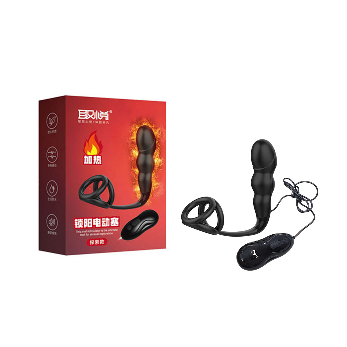 Estimulador de próstata com anel para escroto, aquecimento e 12 modos de vibração. Acompanha controle remoto com fio. Chega mais!