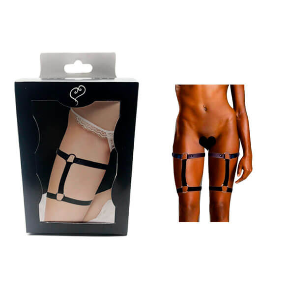 Arreio para coxas em couro ecológico resistente com detalhes em rebites e ajuste de fivela em 5 etapas.